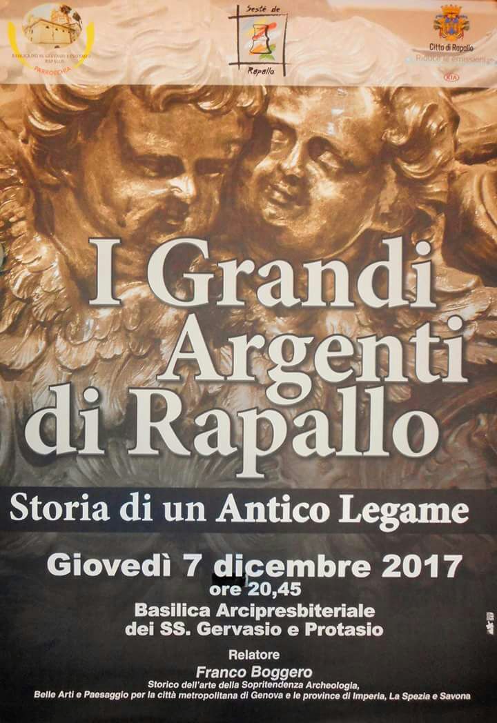 In occasione del 460°anniversario dell'AApparizione di N.S. di Montallegro a Rapallo nonchè 250°della proclsmszione della Vergine stessa come Patrona dell?allora Capitaneato di Rapallo,la parrocchia dei Santi Gervasio e Protasio insieme al Comitato dei Sestieri cittadini,organizzano una conferenza sul tema "I grandi argenti di Rapallo"con protagonista l'Arca Argentea de N.S. di Montallegro.La "messa in cassa" della Vergine ogni anno segna l'inizio delle manifestazioni in onore della Patrona Rapallese,l'arca argentea è quindi una delle parti piu amate dalla popolazione,commissionata nel 1698 dall'Arciprete Gerolamo Merello e dai Massari della parrocchia l'arca è un'opera d'arte arricchita di particolari,dettagli meraviglie in argento,a raccontarla e spoegarla sarà il Prof. Franco Boggero storico dell'arte della Soprintendenza archeologica,un'autorità nel campo delle opere arrgentee.